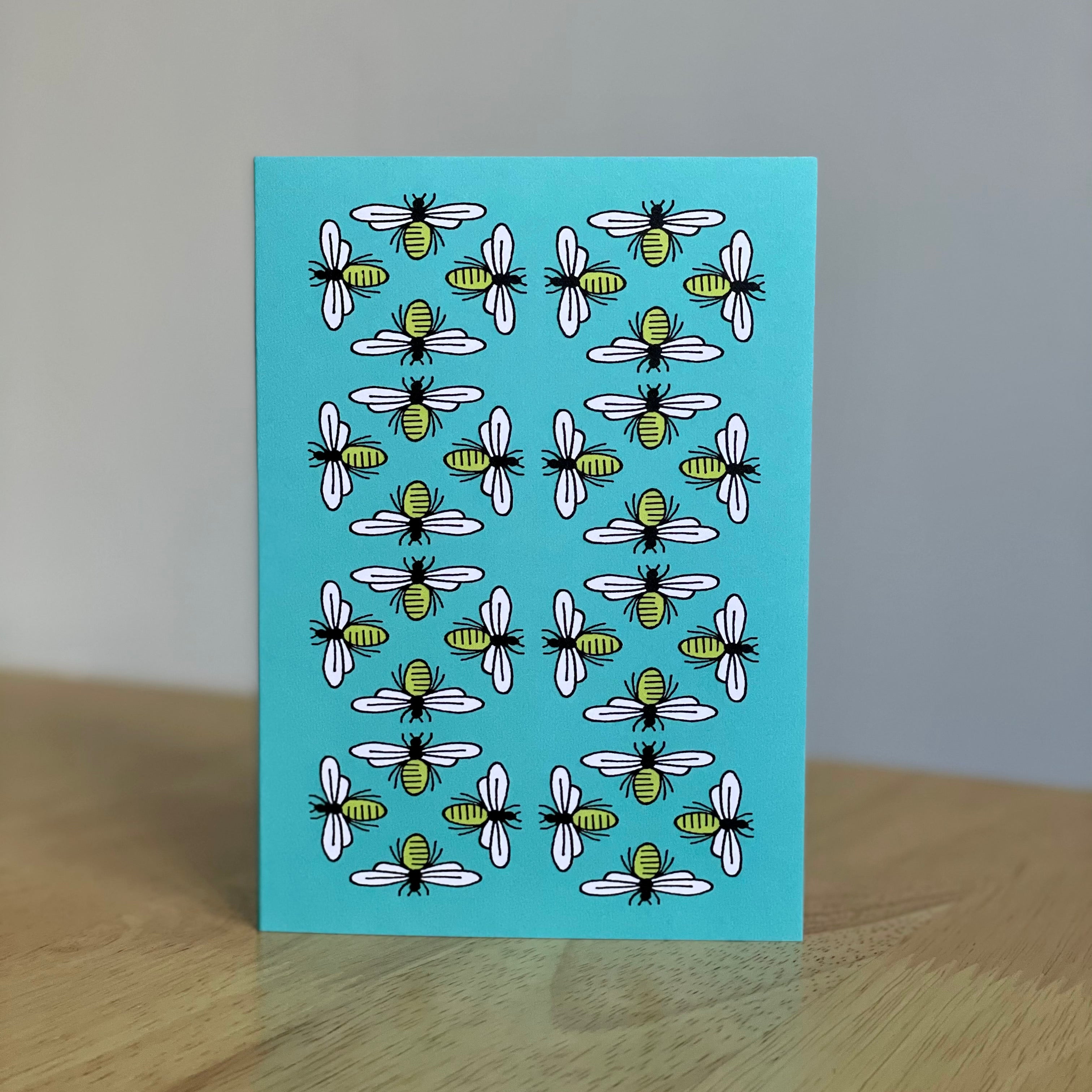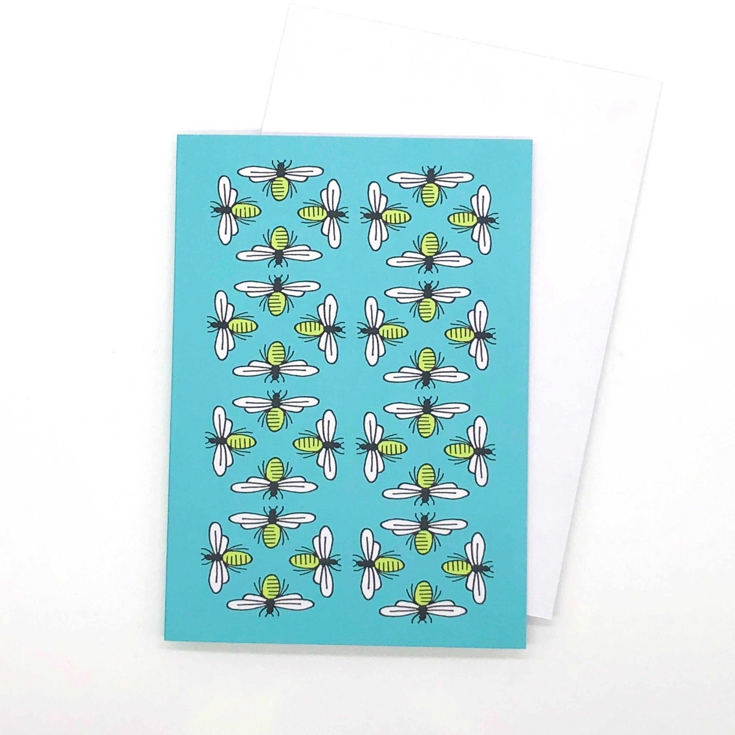 A striking everyday greetings card featuring our busy Lime Tree Design bees in white and lime green on a turquoise background.