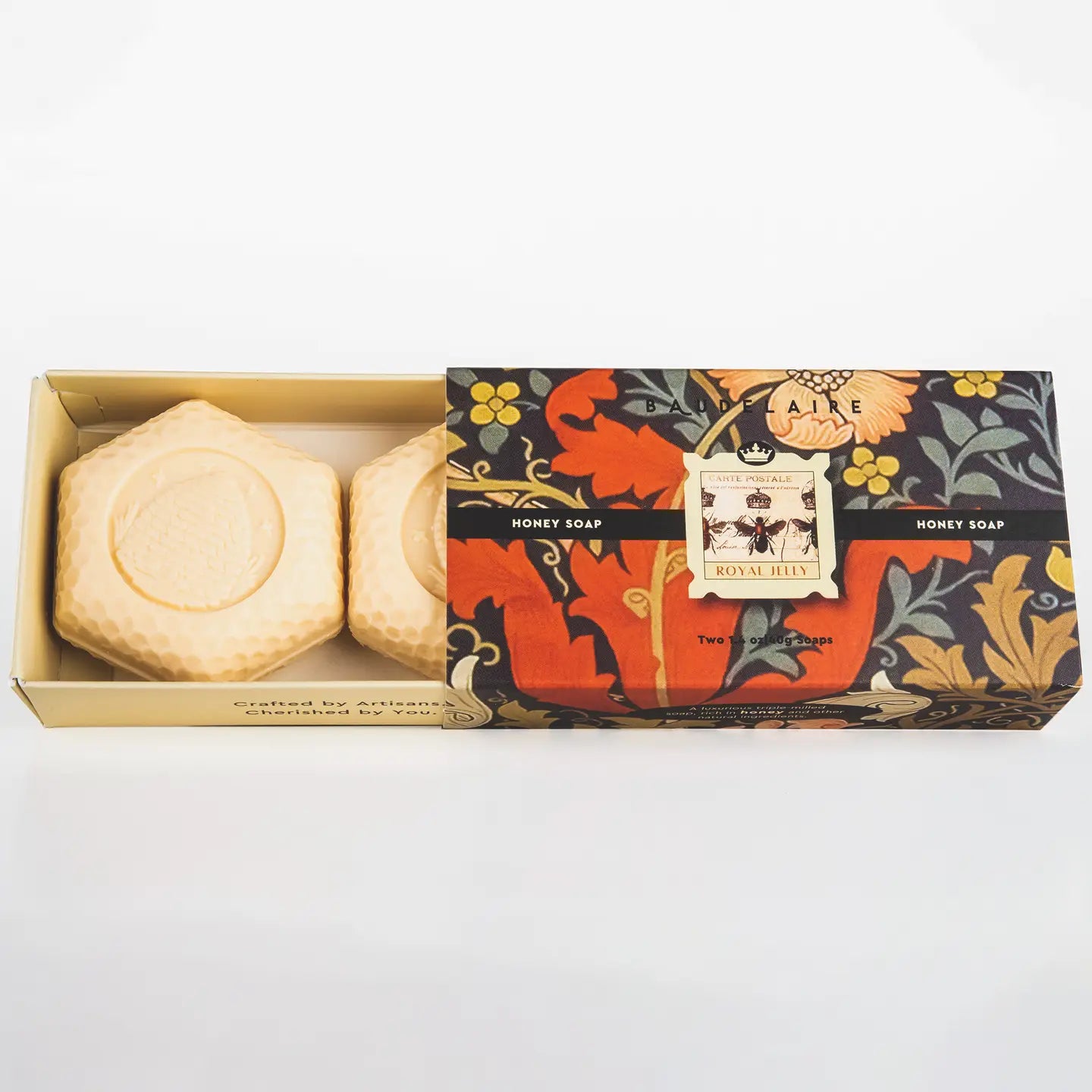 Two 1.4 oz hexagon honey soaps in a matchbox gift box.