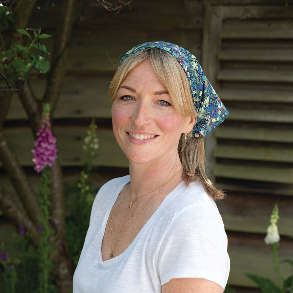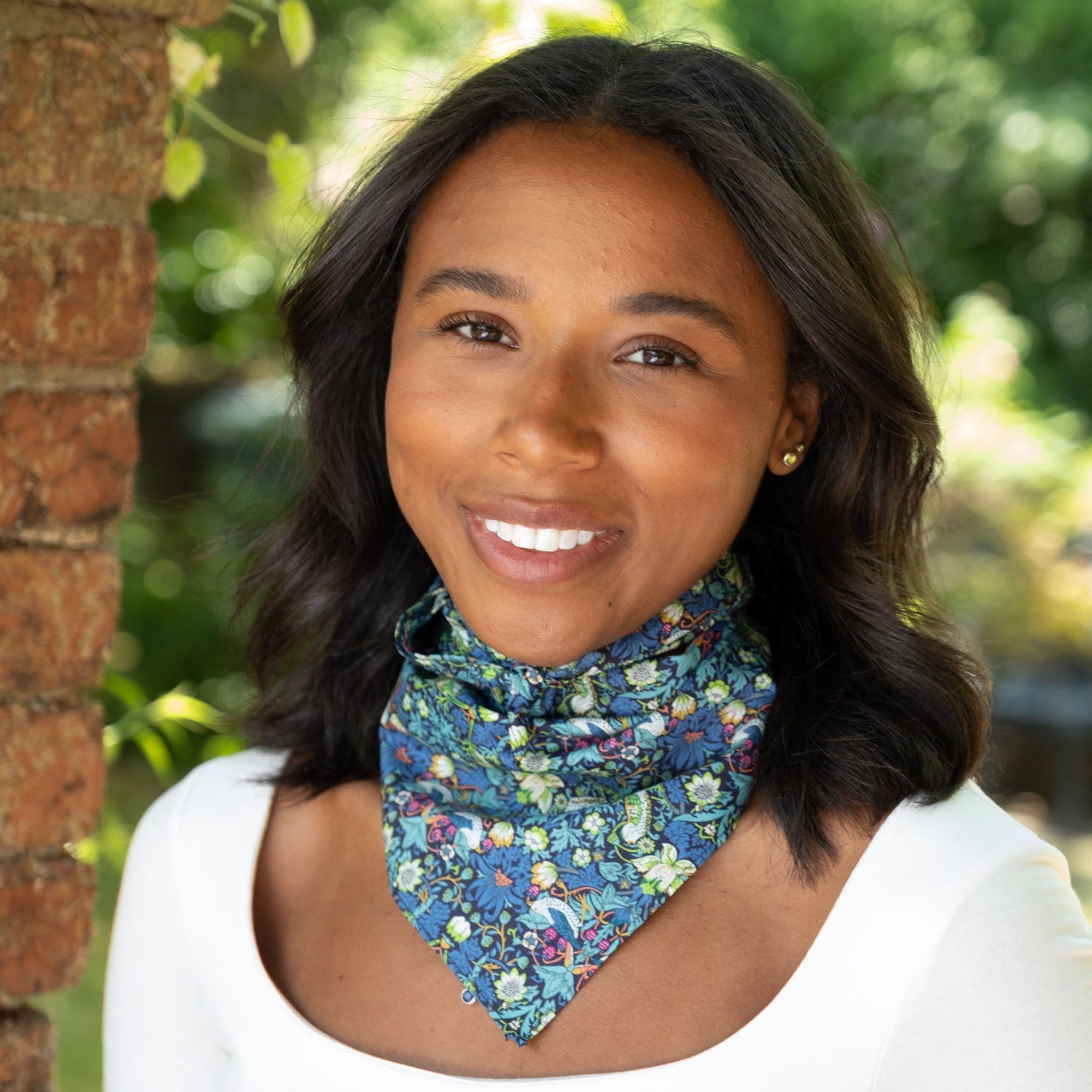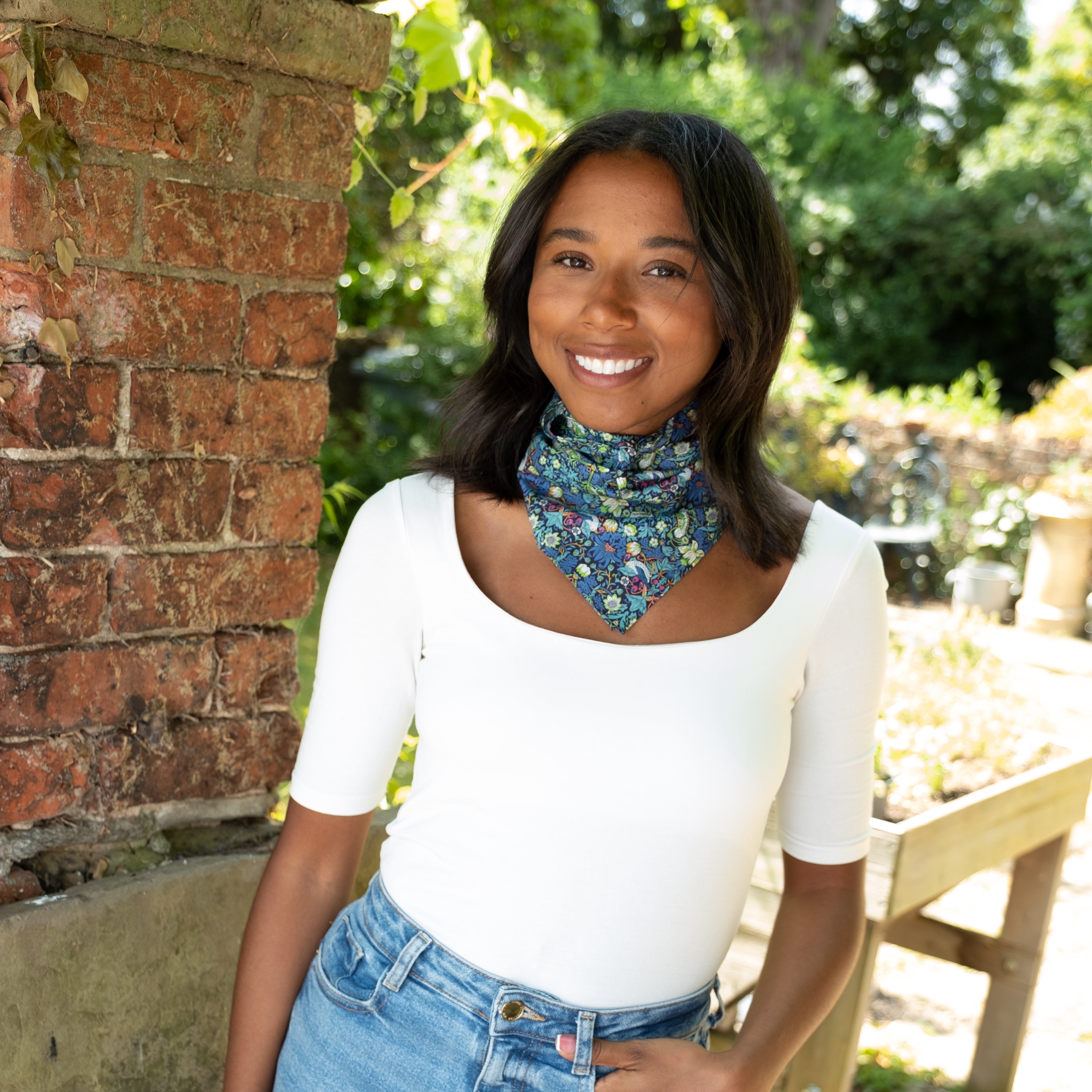Headscarf made with Liberty Tana Lawn™ in its blue Strawberry Thief print.