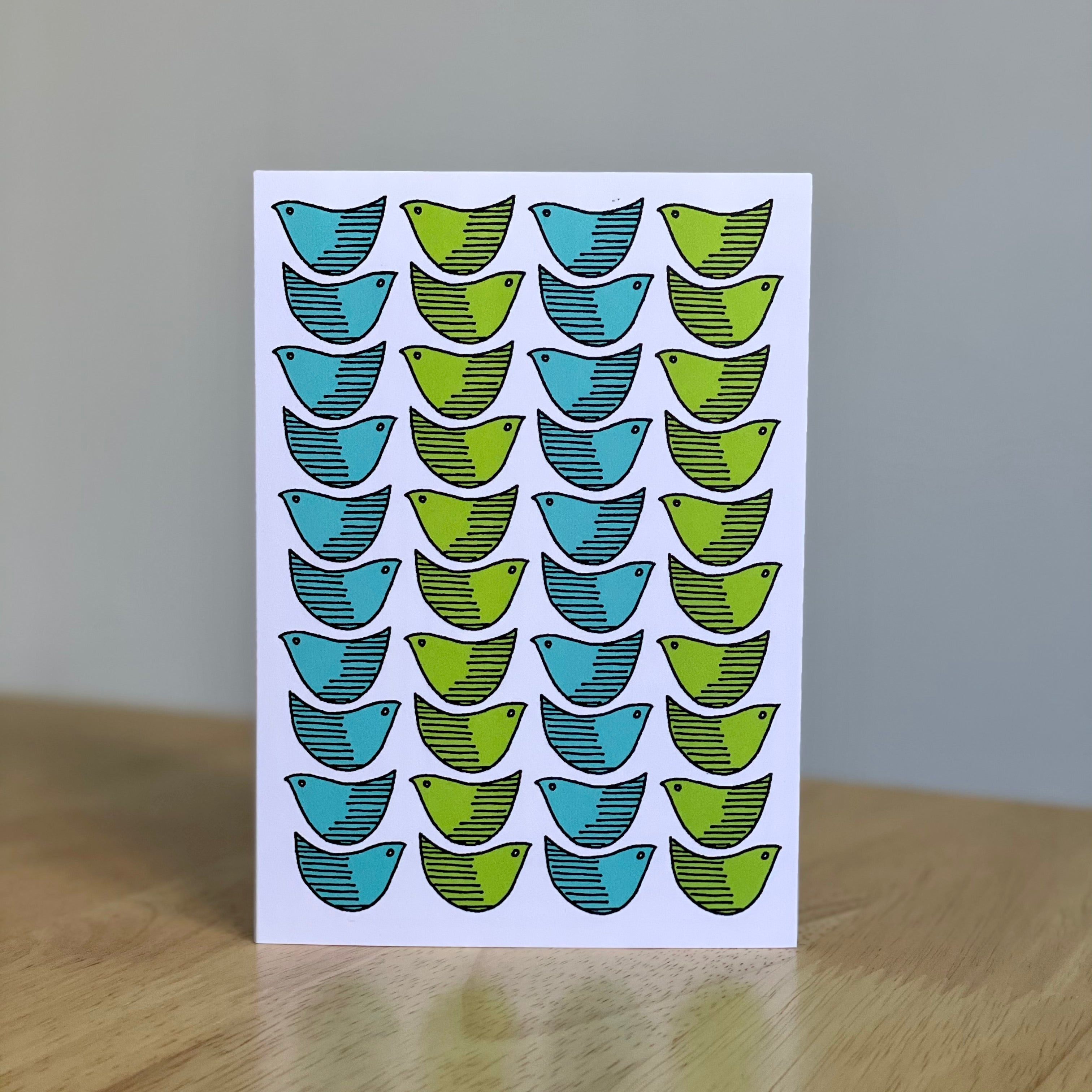 A striking everyday greetings card featuring our Lime Tree Design birds in turquoise and green on a white background.