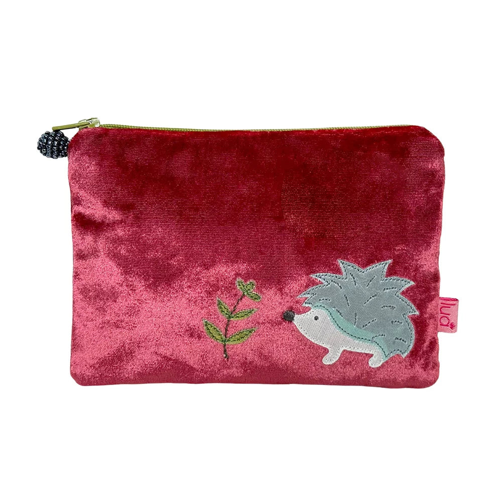 Purse made by Lua in beautiful earth red velvet with a cute appliqued hedgehog and a contrasting zip and beaded zip pull.