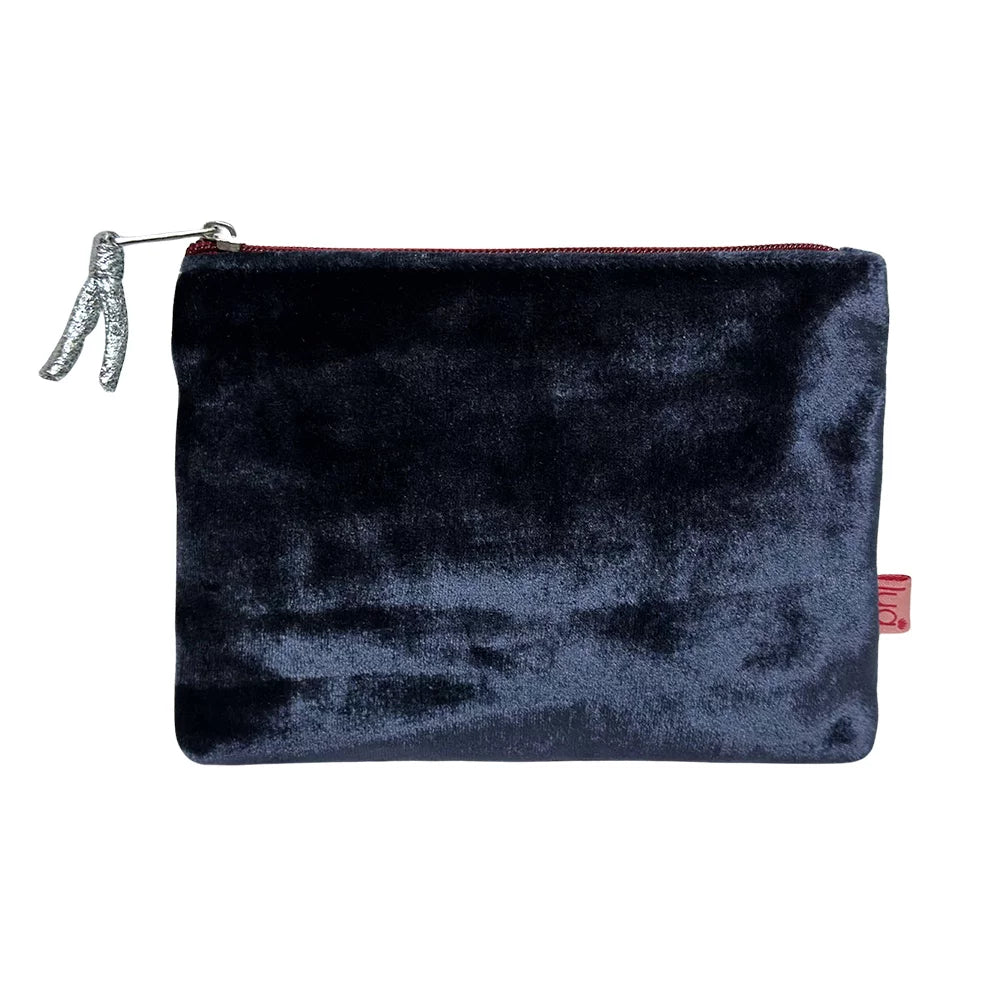 Purse made by Lua in deep navy velvet with a contrasting brick red zip.