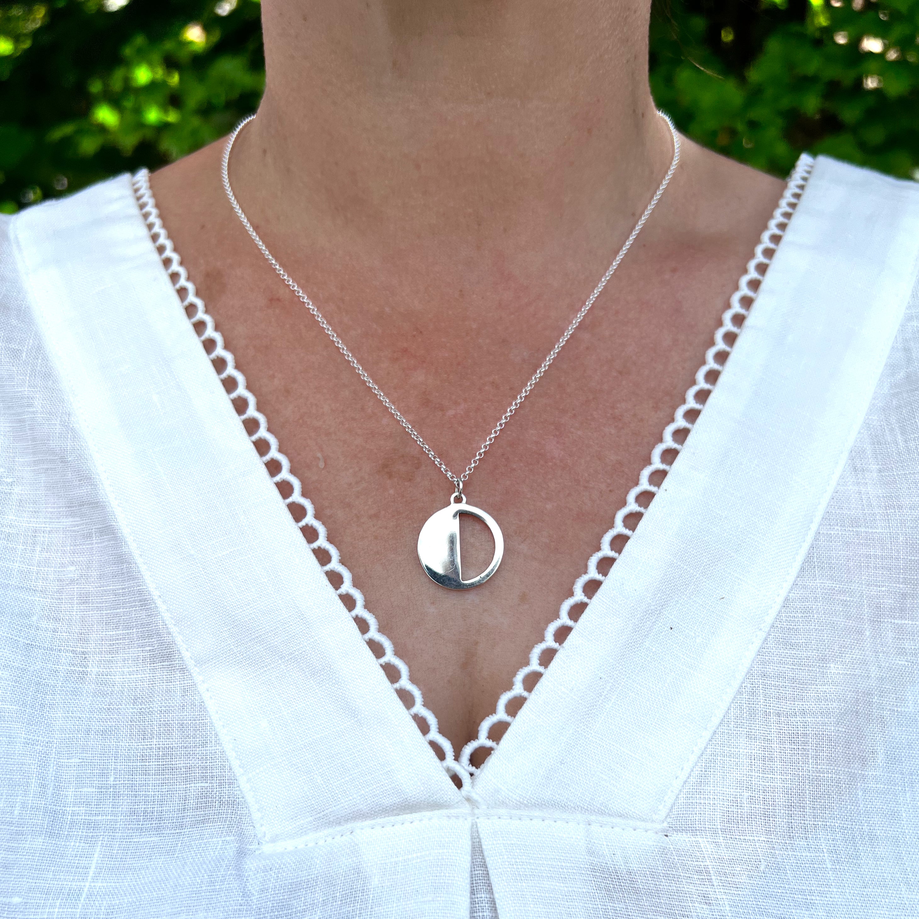 Disc Pendant Necklace with Half Moon Cutout in Sterling Silver.