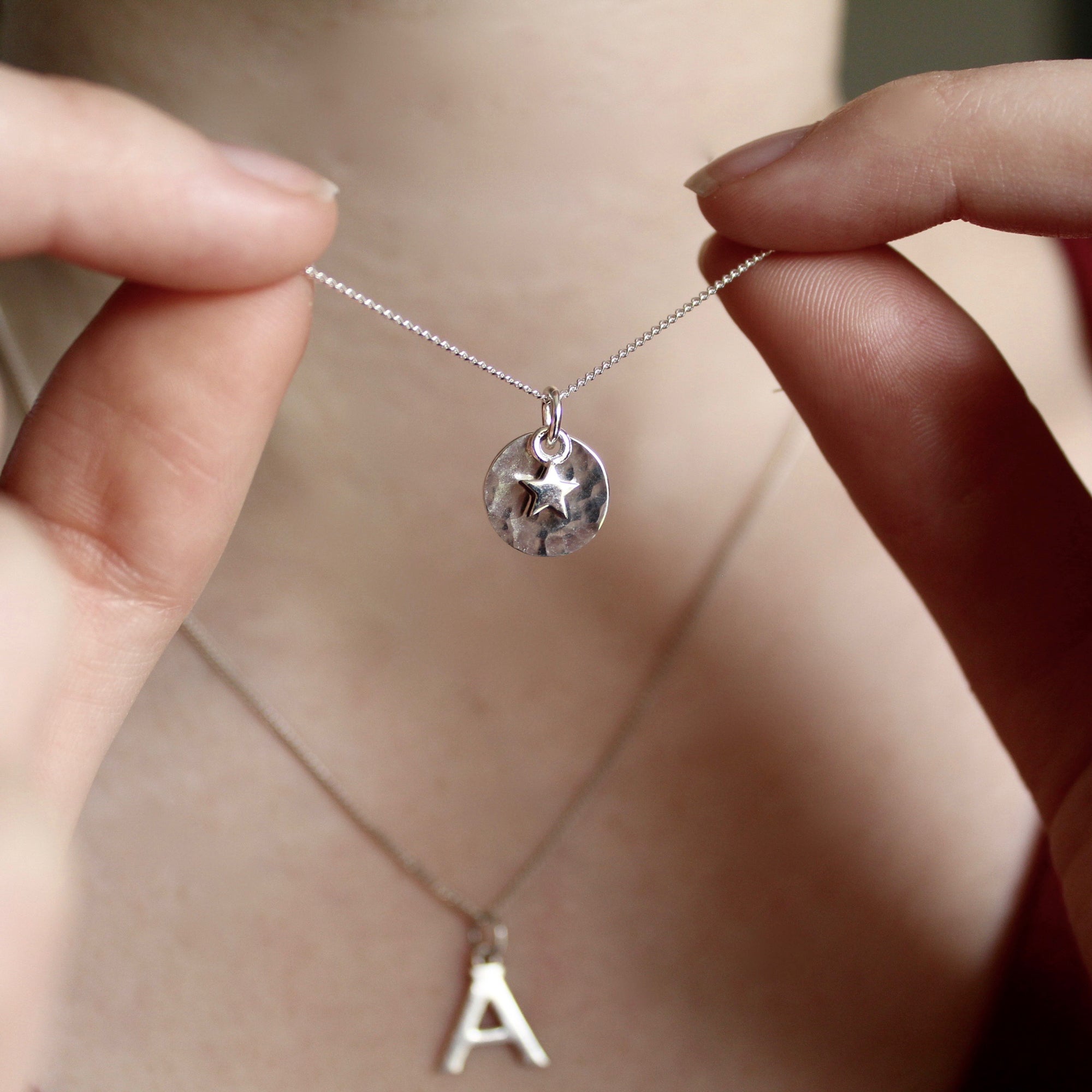 This sterling silver necklace features our mini hammered disc layered with our mini star charm.