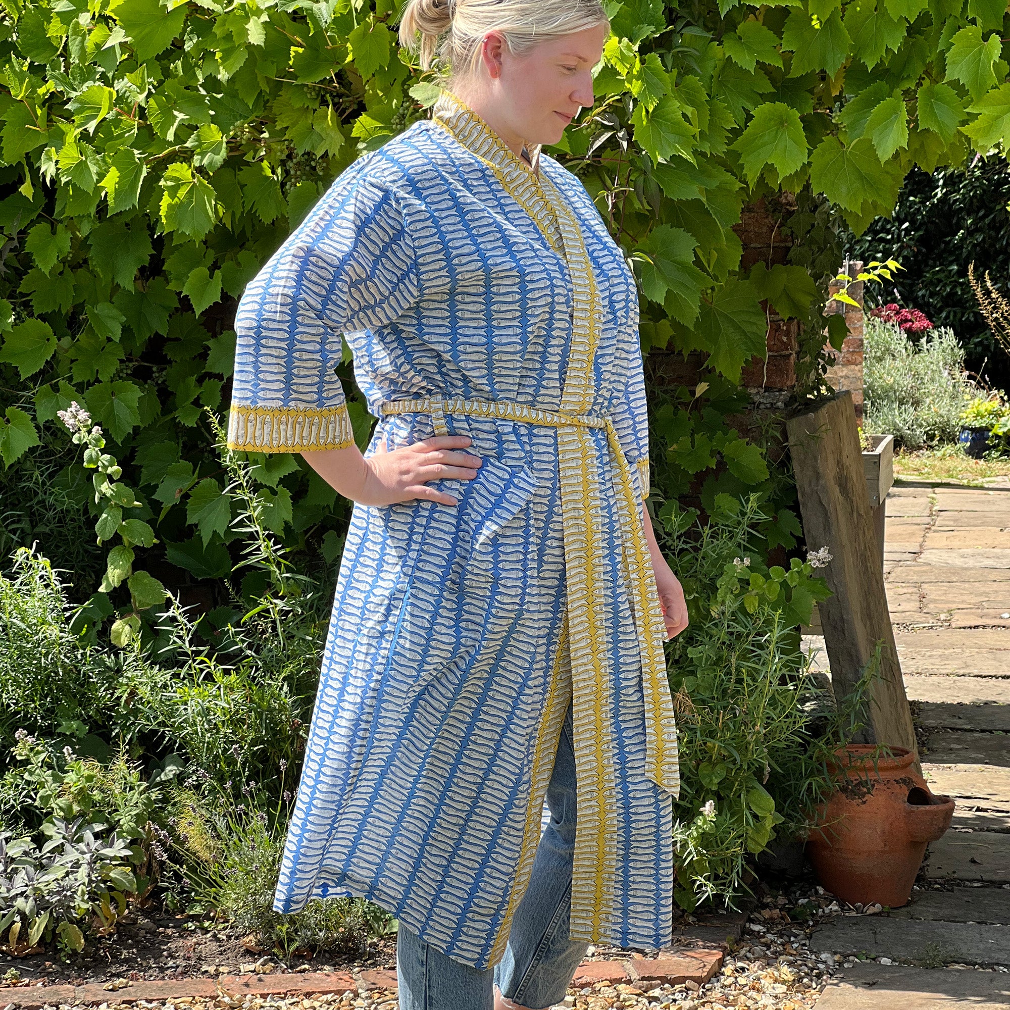 Cotton kimono made from our unique fish print inspired by Indian block print.