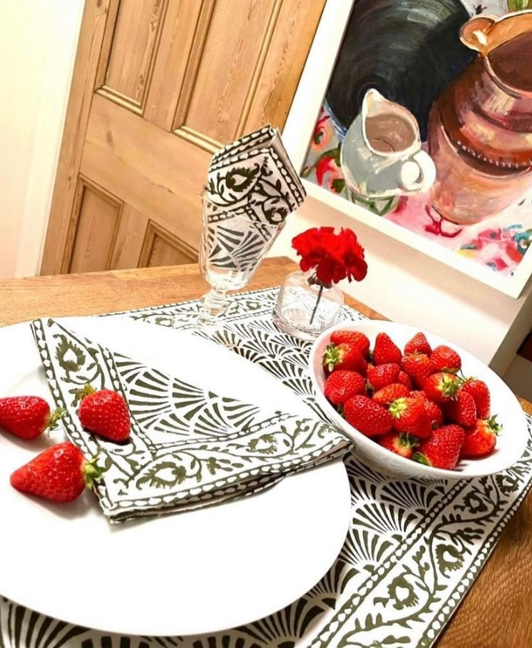 Dining room with a floral tablecloth, chairs, and decorative elements.
