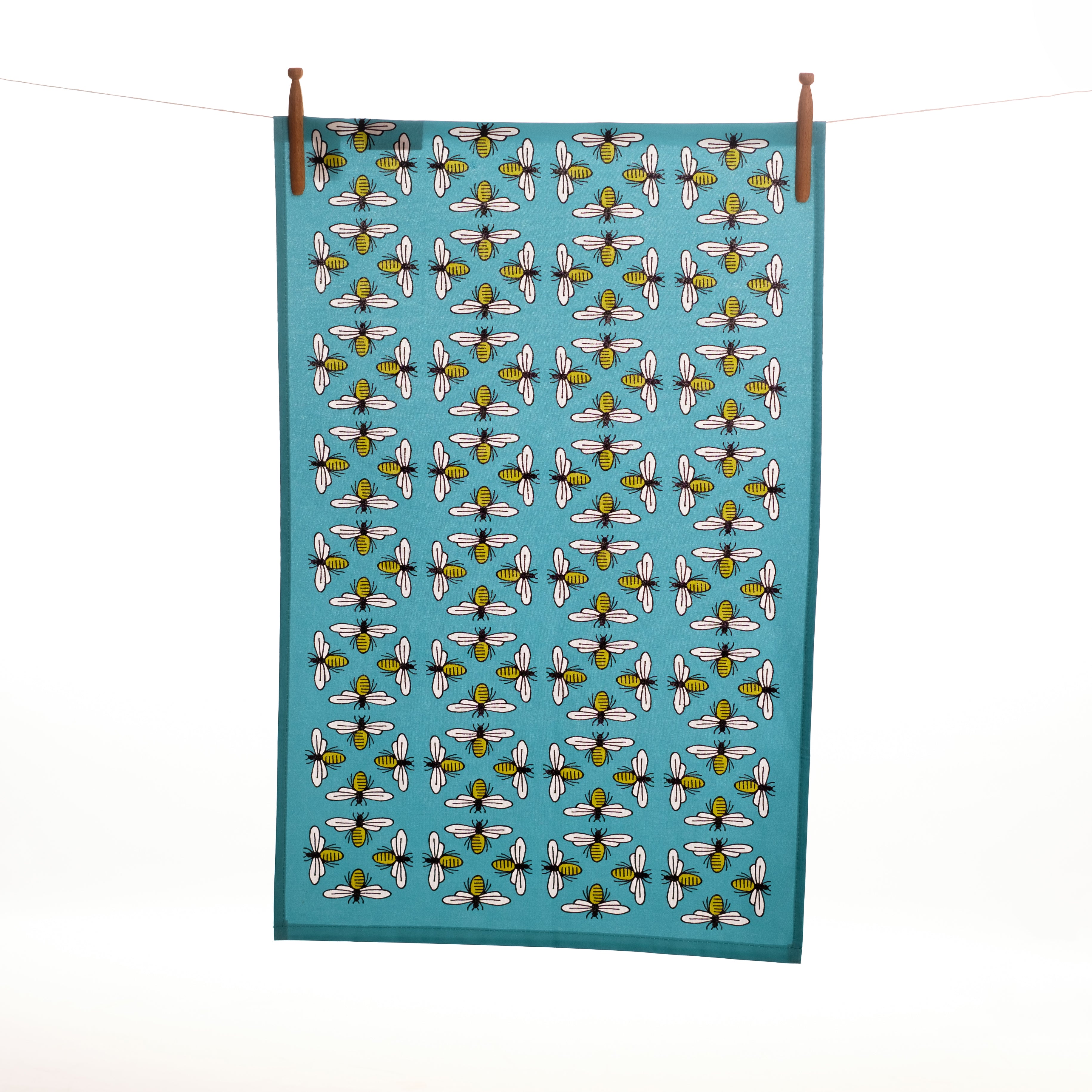 A striking tea towel featuring our Lime Tree Design bees in yellow and white on a turquoise blue background.